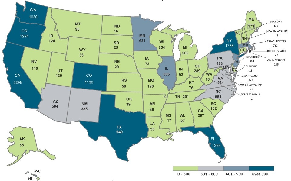 콜로라도(CO, 1,130명), 워싱턴(WA, 1,030명), 텍사스(TX, 940명) 등 7개 주였고 601~900명은 뉴저지(NJ, 864명), 매사추세츠주(MA, 763명), 일리노이(IL, 666명), 미네소타(MN, 631명) 5개주였다. 또한 301~600명은 노스캐롤라이나(NC, 561명), 버지니아(VA, 524명), 애리조나(AZ, 504명), 펜실베니아(PA, 433명), 뉴멕시코(MN, 385명), 메릴랜드(MD, 373명) 6개주였다.
