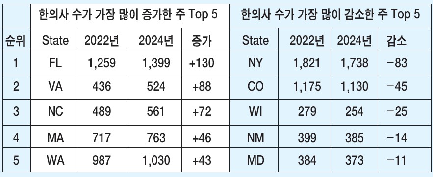 2022년과 대비해 2년 동안 한의사 수가 가장 많이 증가한 주 톱 5는 플로리다주(FL, 130명), 버지니아주(VA, 88명), 노스캐롤라이나(NC, 72명), 메사추세츠(MA, 46명), 워싱턴(WA, 43명) 등이었다.