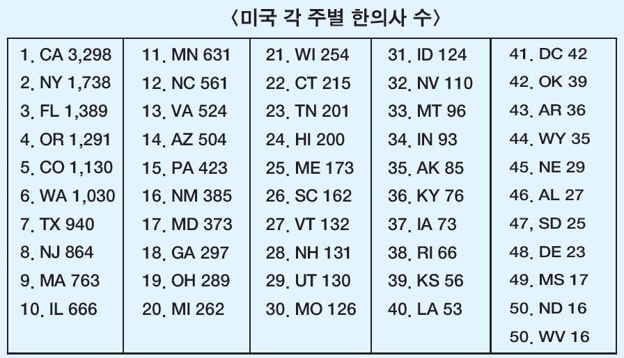 <미국 각 주별 한의사 수>